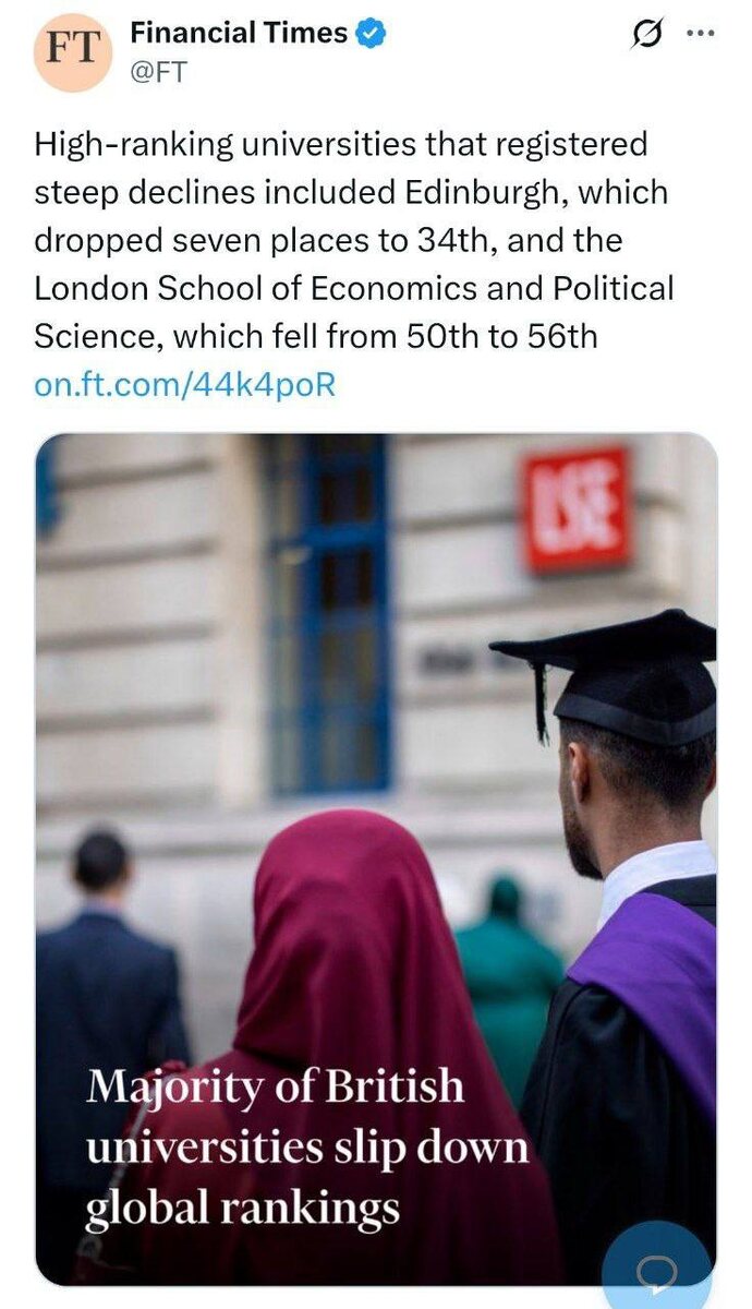 The Financial Times с помощью картинки намекает почему британские университеты теряют места в рейтинге мировых вузов