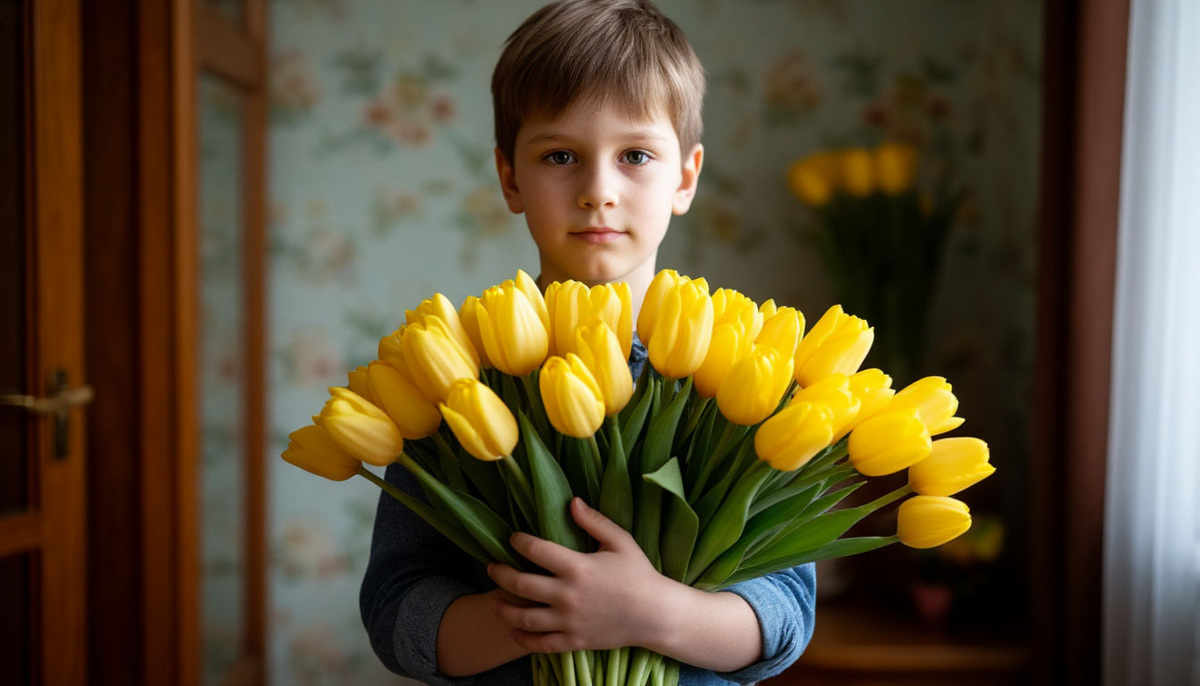 На днях мой восьмилетний сын Мишка влетел домой с огромной охапкой жёлтых тюльпанов. Цветы были яркие, свежие, с ещё не полностью распустившимися бутонами, и пахли так, будто их только что срезали с грядки. Я, честно говоря, сначала растаяла. Ну как тут не умилиться? Мой мальчик, такой серьёзный, с перепачканными коленками и растрёпанной чёлкой, гордо протягивает мне букет и говорит: «Мам, это тебе!»