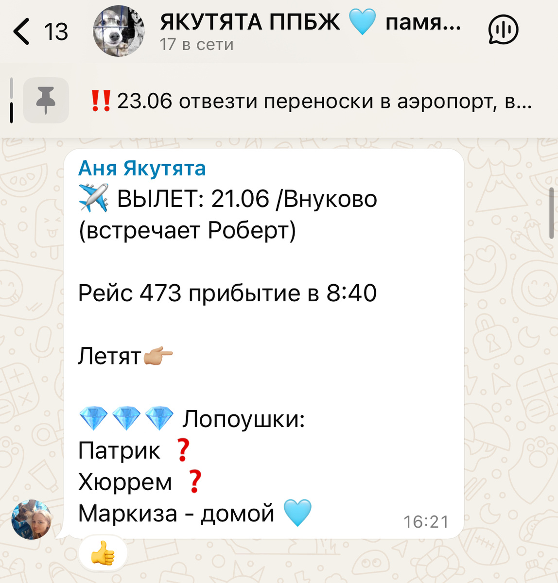 Тут такое дело… У нас нарисовался вылет, и следом возник вопрос с их передержкой в Москве! Точнее, есть вариант, но возможен только через две недели!!! Вылет терять нельзя, поэтому мы в экстренном порядке ищем добрых людей, которые смогли бы помочь и взять двоих «лопоушек» на неделю, максимум две! 🙌 Все необходимое предоставим, и вообще условия оговариваются, нам правда очень нужна помощь!!!! Только есть нюанс: У них был коронавирусный энтерит! Это важно! Если есть животные, то должны быть привитые мультиканом! Взрослые редко им болеют, в основном молодняк и могут пожилые схватить! Это нужно учитывать! 👆 А может Вы сразу подарите дом кому-то из них!!! Одной малышке, Маркизе, почти повезло🙏 Почему «почти»? - Потому что она возможно сразу поедет в семью, но не будем забегать вперед, чтобы не сглазить!!!🙌 Позже все расскажем☺️ А пока двум крохам некуда деться по прилету в Москву🥺 Может среди Вас найдутся добровольцы, желающие спасти якутенка и подарить ему дом и свои любовь и забо