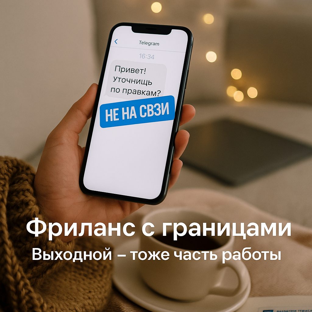 Фриланс дарит свободу — но почему-то именно фрилансеры чаще всего работают без выходных, без часов и без границ. Ты просыпаешься — и сразу проверяешь сообщения. Вечером клиент «на пять минут». В воскресенье — «ну я же всё равно дома». И вот ты уже живёшь в режиме работа всегда, а отдыха — никогда. Когда ты всегда доступна — ты сама даёшь сигнал: «можно в любое время», «можно без границ». Но работа в таком режиме не делает тебя лучше. Она делает тебя усталой, раздражённой и выгоревшей. Он не должен быть строгим — но он должен быть. Например: — с 10 до 18 я на связи — после 18 не проверяю почту — воскресенье — выходной, даже если много задач Твоя нервная система будет тебе благодарна. Фрилансер часто живёт с чувством: «если я не работаю, значит, я теряю деньги». Но правда в том, что усталый фрилансер не эффективен. Отдых — это часть работы. Без него нет ни концентрации, ни креатива, ни удовольствия от процесса. Простой шаблон: «Я работаю с 10 до 18 по будням. Всё, что приходит вечером —