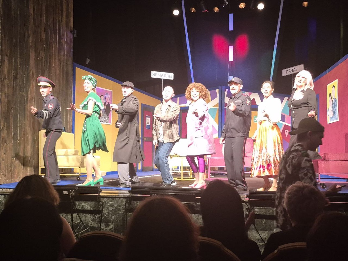 Все маски сняты..Ансамбль артистов Мензелинского театра, которые выпустили спектакль " За двумя зайцами.. У дальнобойщика два дома и две жены..В конце узнаем, что есть еще третья.....жена..уже с ребенком от него!