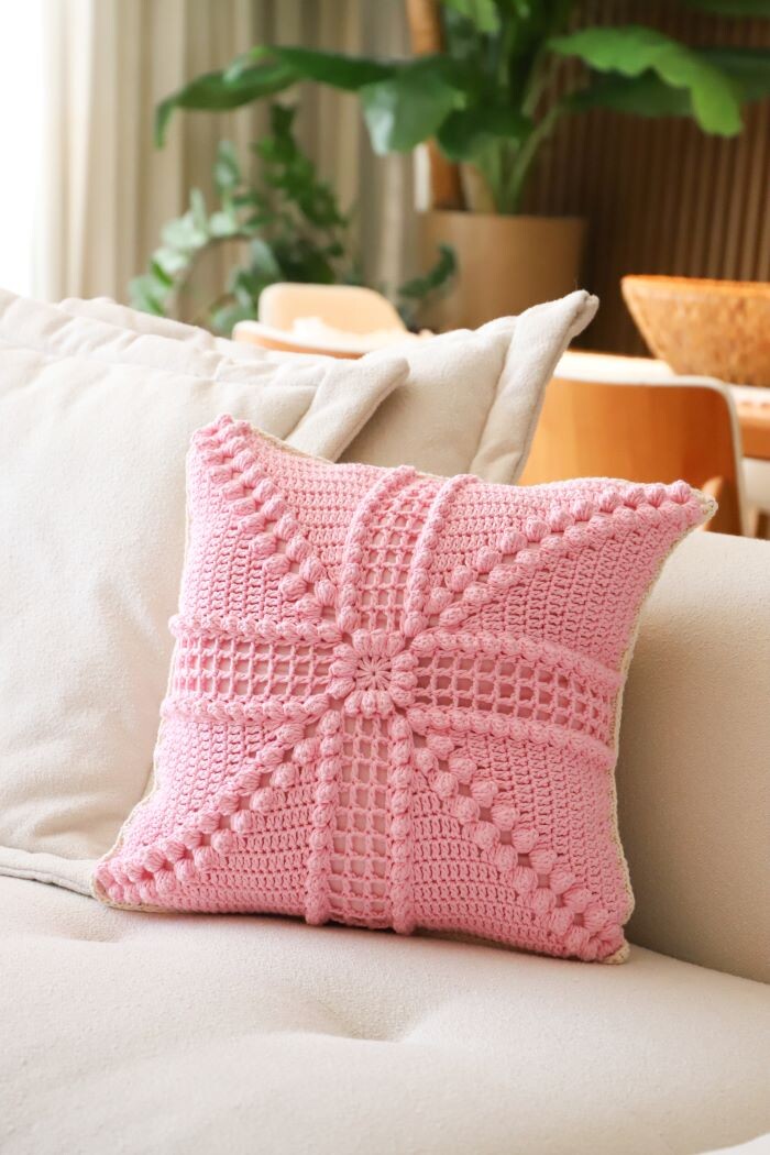 Вам потребуется: 400 гр. пряжи розового цвета (100% хлопок; 200 гр./226 м) и 400 гр. пряжи натурального цвета (100% хлопок; 400 гр./677 м); крючок № 3,5; наволочка размером 50х50 см.