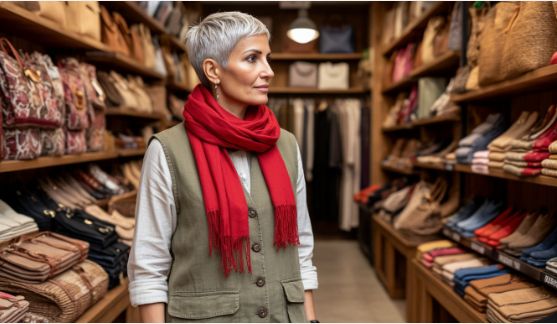 Увидев широко раскрытые глаза клиентки, она нисколько не растерялась, пригласила ее выйти в торговый зал, критически осмотрела, потом повернулась к витрине с палантинами и шарфиками, выудила из общей массы нашейный платок в рыжую клетку на фоне хаки и накинула его на плечи Ольги.