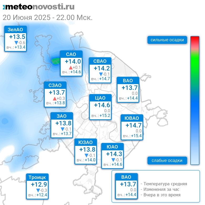 В 22:00 в Москве было от +12.7°C до +15.1°C, средняя температура +13.9°C #погода #Москва #лето #температура #20июня #пятница