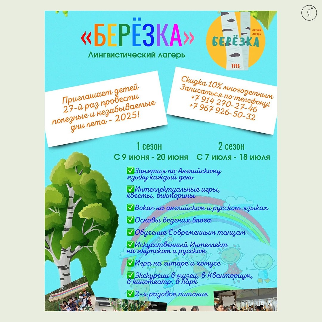 Лингвистический лагерь «Берёзка» #ЛетнийЛагерь #МК #Детям Для детей от 6 до 16 лет В программе: 🤩 Занятия по Английскому языку каждый день; 🤩 Интеллектуальные игры, квесты, викторины; 🤩 Вокал на английском и русском языках; 🤩 Основы ведения блога; 🤩 Обучение Современным танцам; 🤩 Искусственный Интеллект на якутском и русском; 🤩 Игра на гитаре и хомусе; 🤩 Экскурсии в музеи, в Кванториум, в кинотеатр, в парк 🤩 2-х разовое питание с 10:00 до 18:00 с 7 июля - 18 июля пр. Ленина, 1, 3 этаж 20000 руб. +79142702746 Online Якутия | Подписаться