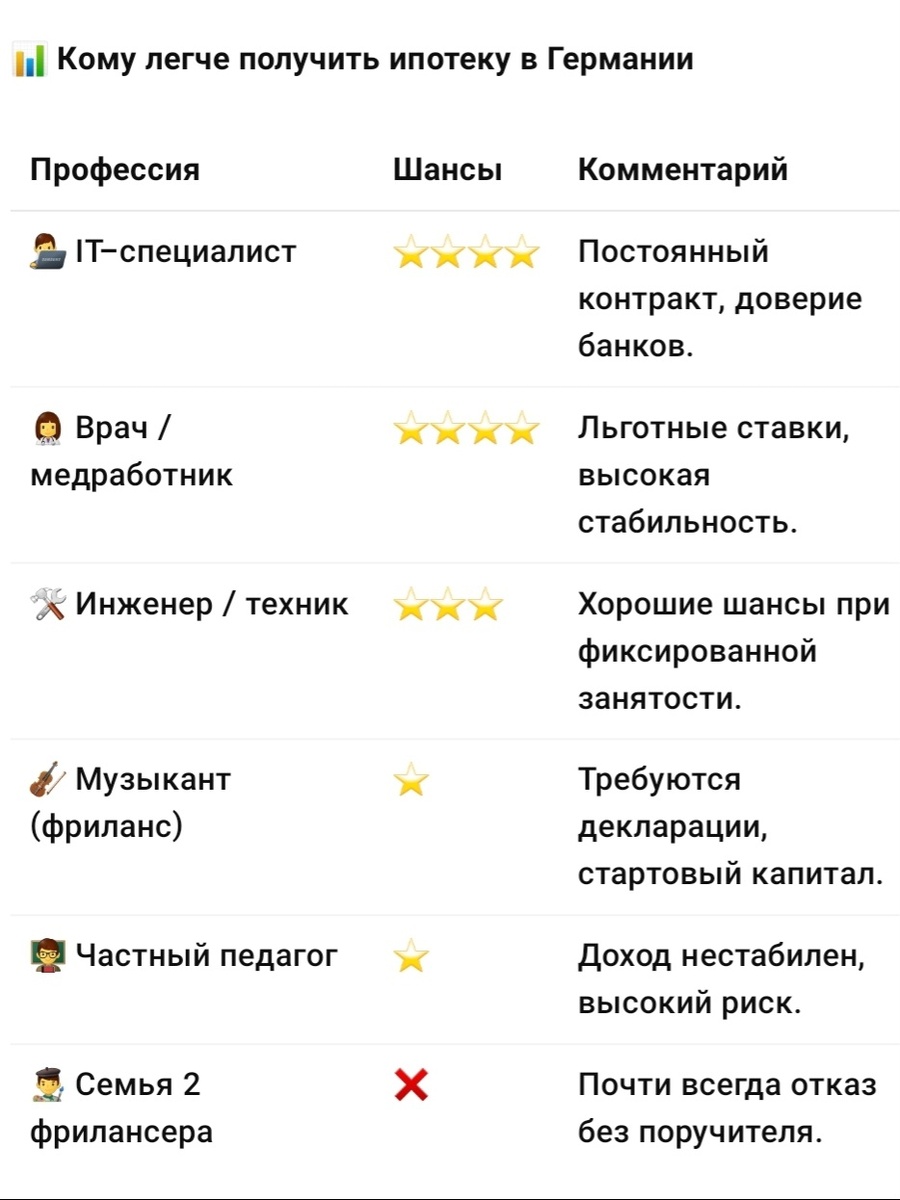 Реальная история, немного статистики и важное о банковской системе. Я работаю музыкантом. Это значит, что я живу между вдохновением и расписанием, между концертом и уроком, между клавишами и тишиной. Но однажды музыка перестала помещаться в съёмной квартире… Когда мы только переехали в Германию, у нас не было ничего — только старое фортепиано, которое занесли через кладбище. А позже — блестящий рояль, который нельзя было трогать: соседи звонили в дверь через минуту после аккорда. Тогда я мечтала: когда-нибудь у меня будет дом, в котором можно просто играть. Не прятаться. Не бояться. Но дом мечты для многих музыкантов так и остаётся мечтой. Когда музыкант приходит в банк с просьбой о кредите, ему чаще всего улыбаются — и отказывают. В Германии творческие профессии считаются нестабильными. Даже если ты много лет преподаёшь, платишь налоги, у тебя ученики, концерты — ты «рисковый клиент». Большинство творческих профессий в Германии работают как Freiberufler (свободные профессии) — это пр