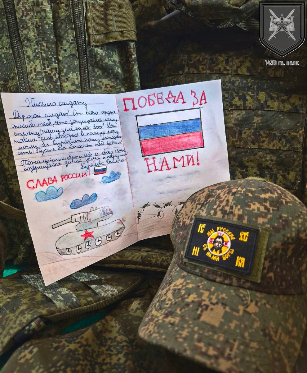 Боец 1430 гвардейского полка ответил на письмо Дарье Куренковой Дорогой солдат! От всего сердца спасибо тебе, что защищаешь нашу страну, нашу страну, нашу землю, нас всех! Нет таких слов, которые в полную меру могли бы выразить нашу благодарность! Пусть Бог помогает тебе во всем! Пожалуйста, береги себя и свою семью, возвращайся домой целым и невредимым! Куренкова Дарья, 9 лет Дорогая Дарья! Благодарю тебя за твои добрые и теплые слова! Ваша поддержка, письма, рисунки, которые вы нам присылаете очень важны для нас. У меня все хорошо, недавно кошка родила котят, теперь у нас в строю пополнение. Светит солнце жарко как на юге только моря не хватает, но ночью довольно прохладно. Кормят нас хорошо, всего хватает. Завтра будем топить баню, на прошлой неделе растопили так, что молодые сползли на полочки пониже, а от веников и вовсе убегали. А все ходили перед баней, храбрились, грудь колесом. Эх молодежь! Только «ветераны» остались на верхних полочках. Хочу тебе пожелать исполнения самых