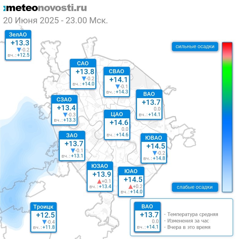 В 23:00 в Москве было от +13°C до +14.8°C, средняя температура +13.9°C #погода #Москва #лето #температура #20июня #пятница