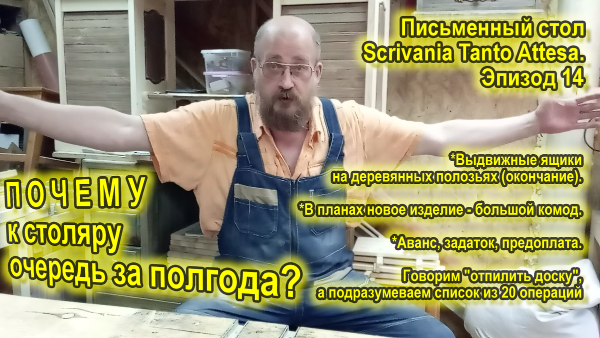 На канале опубликовано новое видео - продолжение сериала о том, как я изготавливаю Письменный стол из сосны Scrivania Tanto Attesa. В этом видеоролике я пытаюсь понять, что означает, когда говорят, мол, "У этого столяра заказы на полгода вперед расписаны". Действительно ли он такой крутой или просто изготовление изделия из древесины очень длительный процесс. Особенно если принимать в расчет и все подготовительные работы. Показываю также, как верно продумать конструкцию выдвижного ящика на деревянных полозьях и, как рассчитать, куда их пришурупливать. Делюсь планами о следующем изделии. Ссылка на видео тут: