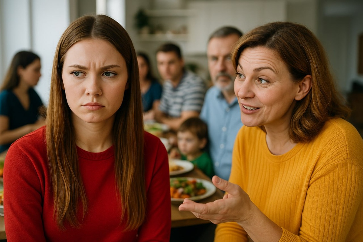 Оля слушает, кивает, но не отвечает. Напряжение между близостью и отчуждённостью висит в воздухе, а семья возвращается за стол, стараясь говорить только о погоде и планах на отпуск.