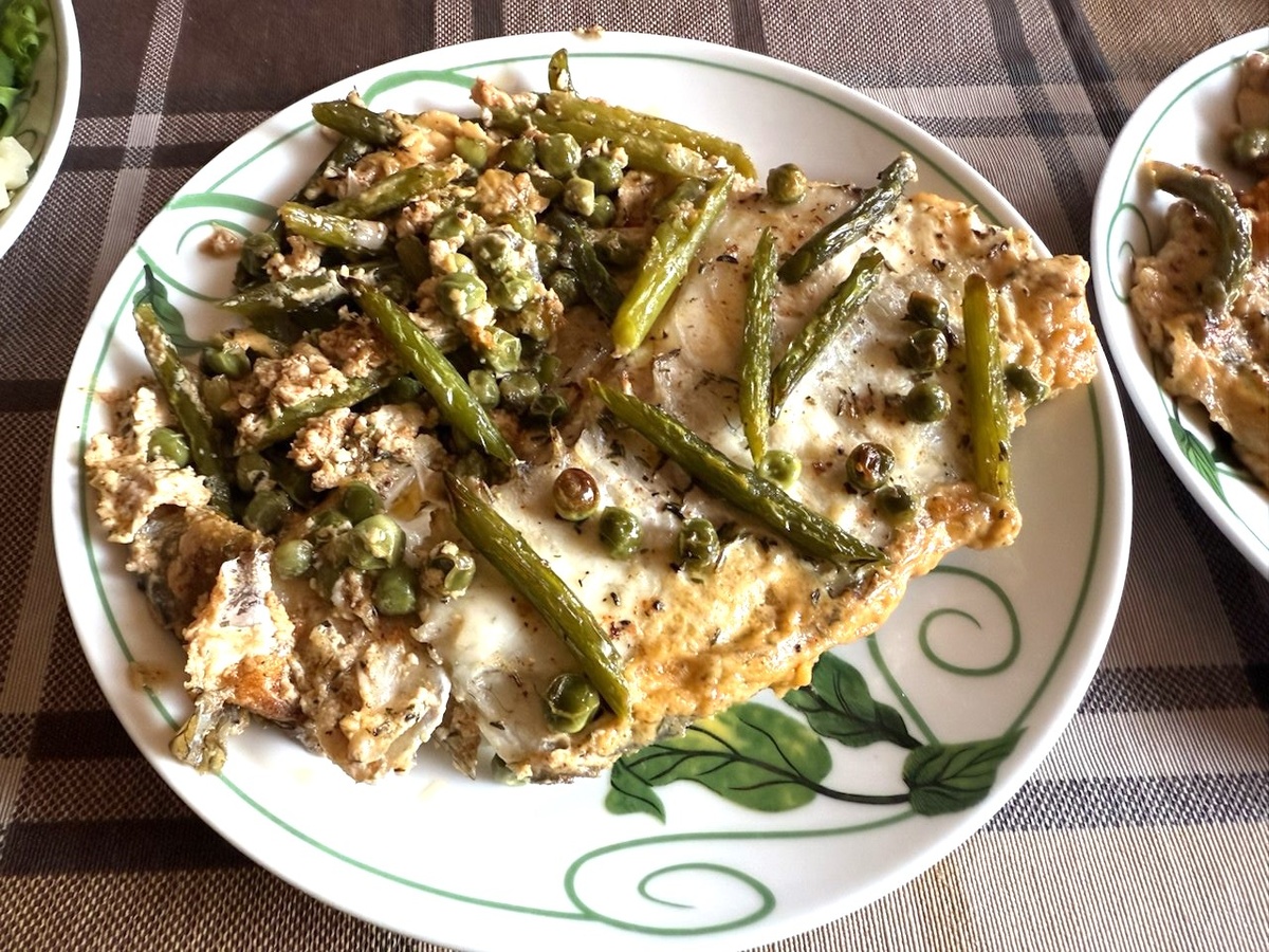 Пожалела, что мало стрелок и зеленого горошка добавила.