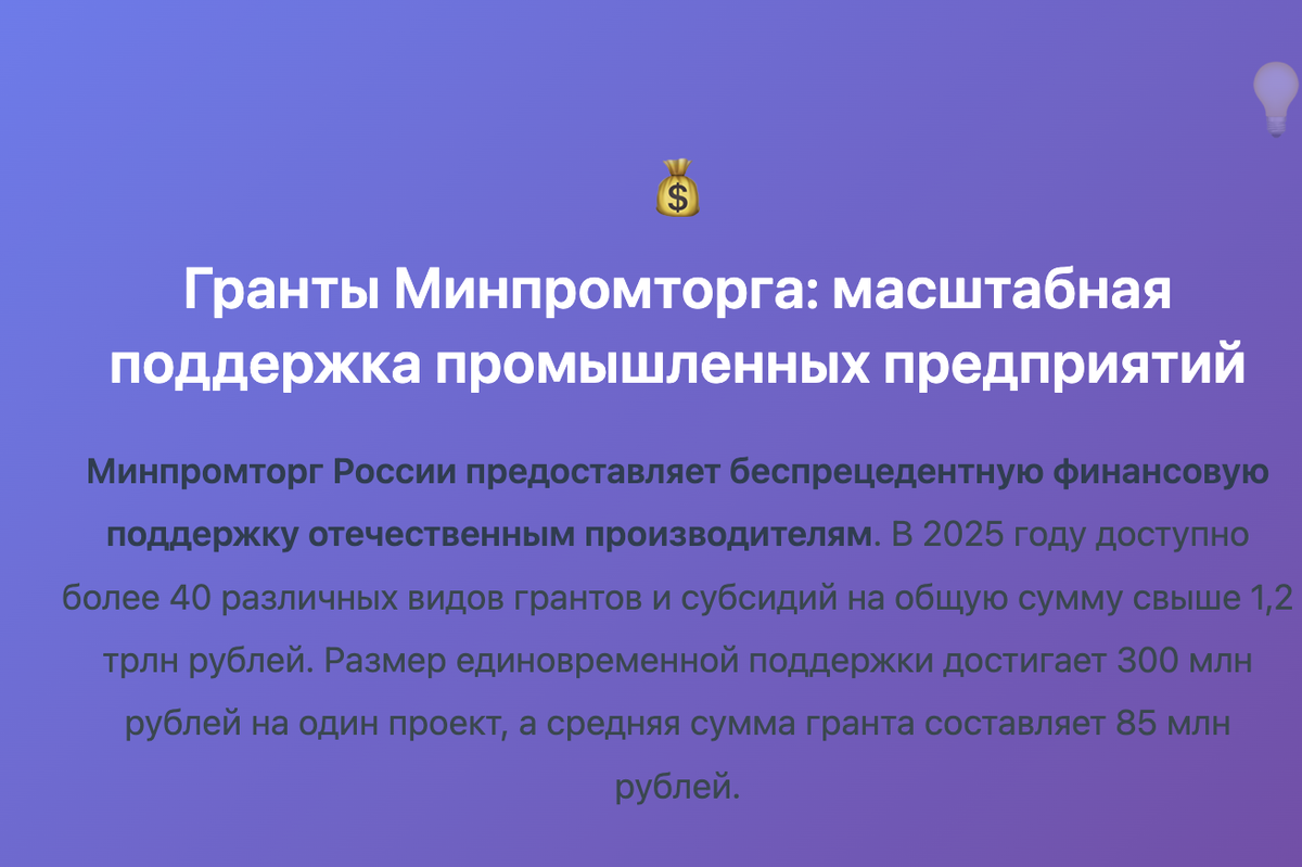 Не упустите возможность получить грант до 300 млн рублей для развития производства. Наши эксперты помогут подготовить документы, включиться в реестр и максимально увеличить шансы на получение финансирования.