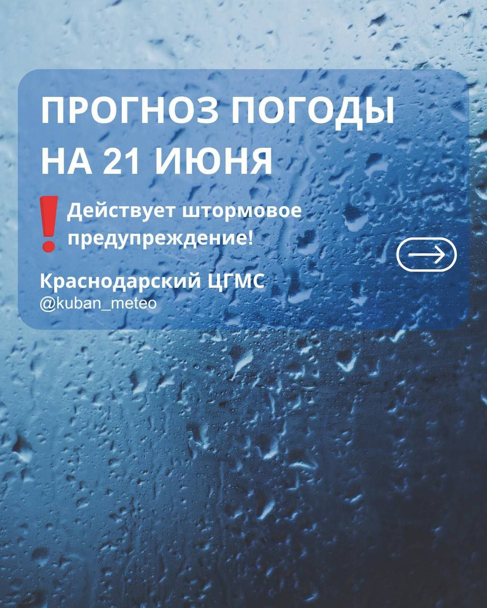 ☁️⛅⛈️ 🌦 На Кубани сохраняется неустойчивая погода. С прохождением фронтовых разделов в отдельных районах ожидаются грозы, ливни и сильный ветер. ⚠️ Сохраняются штормовые предупреждения! 📍 По Краснодарскому краю Переменная облачность. Местами кратковременный дождь, гроза. В отдельных районах — сильный дождь, ливень в сочетании с грозой, градом и порывами ветра 20–25 м/с (КМЯ). Возможны очень сильный дождь (ОЯ), сильный ливень (ОЯ). Ночью и утром местами туман. Ветер юго-западный, западный 4–9 м/с, местами порывы 12–14 м/с, днём и вечером — до 15–18 м/с. 🌡 Температура воздуха: • ночью +11…+16°, • в юго-восточных предгорьях местами +10…+15°, • днём +20…+25°, • в предгорных районах местами +17…+22°, • в горах ночью +4…+9°, днём +7…+12°. 🌊 На Черноморском побережье: ночью +13…+18°, днём +20…+25°. 🏙 По г. Краснодару Переменная облачность. Преимущественно без осадков, но днём 20.06 возможен кратковременный дождь и гроза. Ветер юго-западный, западный: ночью 4–9 м/с, днём 7–12 м/с,