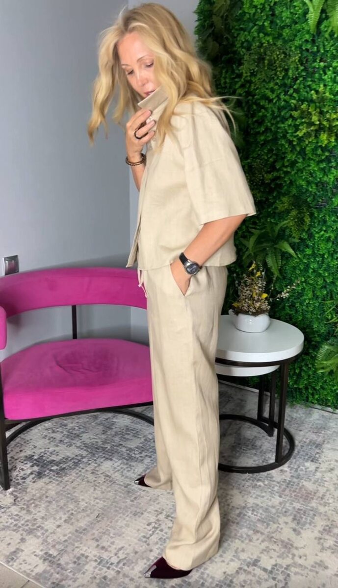 🥂 minimalism, доведенный до 🥂совершенства. 🥂 ✔️Та самая знаменитая ‘тихая роскошь’ / quiet luxury: когда нет логотипов, нет нарочитой демонстрации бренда, но каждая деталь говорит о вкусе и работает на исключительность хозяйки. • костюм из премиального 100% льна с едва заметным лоском . - Воздухопроницаемый, пластичный, износостойкий. - Цвет — нейтральный oat milk / миндальный крем — входит в топ палитры “luxury minimal”. - расслабленный крой с архитектурной точностью — прямые брюки на резинке (умная посадка без давления) и рубашка с укороченным рукавом и мягкой линией плеч. size: S-XL Ольга (на видео) носит российский 48, а костюм сел так, как будто это 42! совет стилистов: носите этот костюм, когда хотите просто быть уверенной в своем стиле. «Как чистый лист». Добавляйте акценты через обувь, сумку. Днём-сандали, вечером - остроносые босоножки. Идеален в летних отпусках, путешествиях, на террасе отеля или бранче и даже в утреннем аэропорту. БРОНИРУЙТЕ! и носите тихий