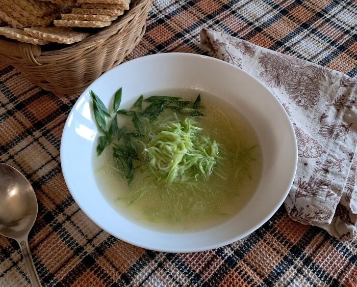 Такой легкий супчик. Вкусный. Мне нравится. ☝ Готовиться за 5 минут 20 секунд Натереть кабачок - 3 минуты Потушить кабачок на растительном масле - 1-2 минуты. Посолить немного в процессе. Нагрев средний Залить кабачок горячим бульоном, добавить зелень - 20 сек Вкусно очень