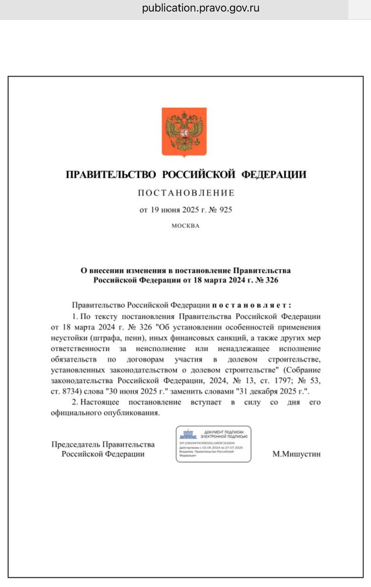 «О внесении изменения в постановление Правительства Российской Федерации от 18 марта 2024 г. № 326» официально опубликовано 20 июня 2025 года.