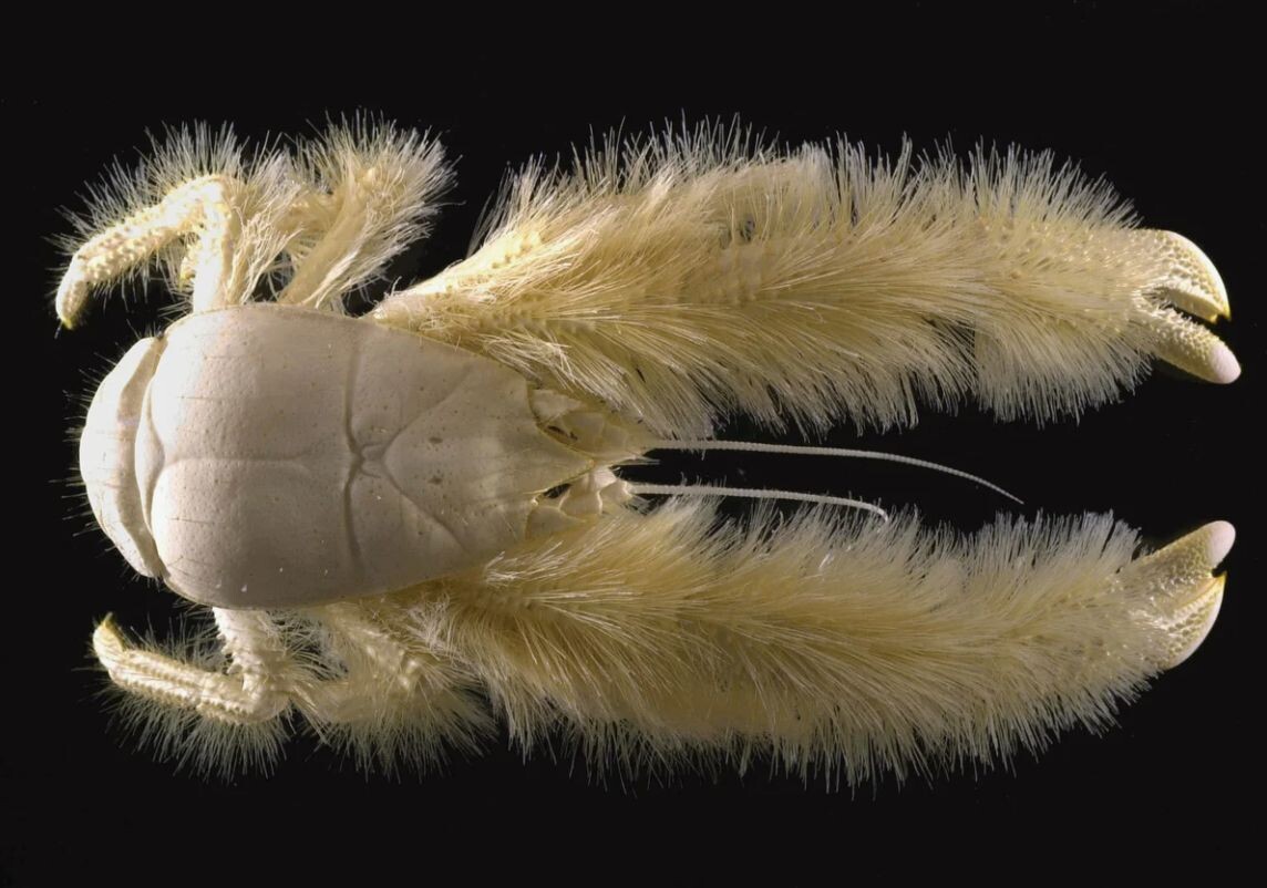 🦀 Краб-йети (Kiwa hirsuta) — пушистый краб с глубин. Официальное имя — Kiwa, в честь полинезийского божества моря. Обитает на глубине 2 километра у гидротермальных источников. Всё его тело покрыто длинными белыми “волосами”, особенно лапки — будто в шубе. В этих волосках живут симбиотические бактерии, которые помогают крабу нейтрализовать токсины из подводных гейзеров. На поверхность он бы не выжил — для него адекватная температура +1...+4 °C. Kiwa hirsuta — хиппи из морской бездны с собственной химической лабораторией.