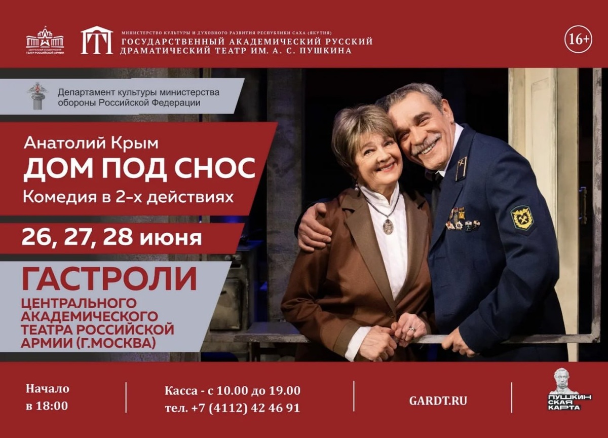 🎭 Гастроли Театра Российской Армии и Донецкого театра имени М.М. Бровуна пройдут в Якутии Так, на сцене Русского театра им. А.Пушкина 26-28 июня в 18:00 якутяне могут увидеть спектакль «Дом под снос» Центрального академического Театра Российской Армии из Москвы. Кроме того, с 4 по 6 июля также на сцене Русского театра состоятся гастроли Донецкого государственного академического музыкально-драматического театра имени М.М. Бровуна. В эти дни 18:00 покажут документальную драму «Я Zнаю праVду». Режиссер — народный артист ДНР Алла Ульянова. Подробнее читайте по ссылке. 🖥 Фото: пресс-служба главы и правительства региона @Якутия 24