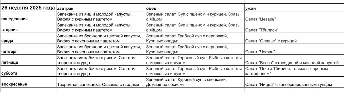 По вашим заявкам выкладываю меню на следующую неделю сегодня, прямо рано-рано))) Ну просто я его уже давно составила) А так как у нас относительно жарко, да и в принципе лето наступило, то попробую я сделать ужин совершенно легким, но сытным) Поэтому всю неделю на ужин у меня будут белковые салаты. Посмотрим что из этого получится. Хотя чего смотреть, я же делала так несколько раз. Получается сытно и хватает сытости до сна. А вот и все! На сегодня все опубликованные рецепты закончились) Будем делать новые))) Тем более на салат "Тбилиси" я многих подсадила, а вот рецепт так ни разу и не выложила)))) Буду исправляться)))