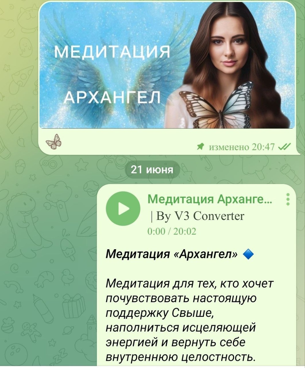 💎 Обновление в закрытом пакете медитаций! Как и обещала, сегодня — в самый мощный период года, в энергии летнего солнцестояния, я добавила в пакет новую медитацию: «Архангел. Исцеление, любовь и защита» Для тех, кто уже в закрытом пространстве — медитация уже доступна к прослушиванию. Это очень сильная практика на очищение, избавление от блоков и подключение к Божественной поддержке.Важно ее делать сегодня.❤️ 🌞А для всех остальных — я открываю доступ к пакету всего на 24 часа, чтобы вы тоже смогли пройти эту трансформацию в самый благоприятный момент года. Потом вход будет снова закрыт и уже по другой цене. 👉Сейчас в пакете уже 18 мощных медитаций, и их станет 23. Это глубокая работа с подсознанием, телом и душой. Мой закрытый пакет медитаций сейчас можно приобрести за 2400 рублей. Внутри будет 23 уникальные авторские медитации с моим трансформационым голосом, каждая — мощный инструмент. 🖊Если разделить 2400 на 23, то стоимость одной медитации — всего 104 рубля. Это меньше ча