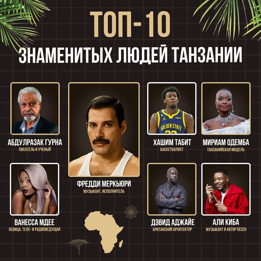 ΠΌΠΈΡΠ°. π€ 1. Π€ΡΠ΅Π΄Π΄ΠΈ ΠΠ΅ΡΠΊΡΡΡΠΈ ΠΠ°, Π³Π»Π°Π²Π½ΡΠΉ Π³ΠΎΠ»ΠΎΡ Queen ΡΠΎΠ΄ΠΈΠ»ΡΡ Π½Π° ΠΎΡΡΡΠΎΠ²Π΅ ΠΠ°Π½Π·ΠΈΠ±Π°Ρ. ΠΠΌΠ΅Π½Π½ΠΎ Π·Π΄Π΅ΡΡ, Π² Π‘ΡΠΎΡΠ½-Π’Π°ΡΠ½Π΅, ΠΎΠ½ ΠΏΡΠΎΠ²ΡΠ» Π΄Π΅ΡΡΡΠ²ΠΎ. ΠΡΠ»ΡΡΠΎΠ²Π°Ρ Π»ΠΈΡΠ½ΠΎΡΡΡ, ΠΊΠΎΡΠΎΡΡΡ ΠΌΡ ΡΠΏΡΠ°Π²Π΅Π΄Π»ΠΈΠ²ΠΎ Π½Π°Π·ΡΠ²Π°Π΅ΠΌ ΠΌΡΠ·ΡΠΊΠ°Π»ΡΠ½ΡΠΌ ΡΠΈΠΌΠ²ΠΎΠ»ΠΎΠΌ XX Π²Π΅ΠΊΠ°. πΆ 2. Diamond Platnumz (ΠΠ°ΡΠΈΠ± ΠΠ±Π΄ΡΠ» ΠΠΆΡΠΌΠ°) ΠΠΎΡΠΎΠ»Ρ ΠΆΠ°Π½ΡΠ° Π±ΠΎΠ½Π³ΠΎ-ΡΠ»Π°Π²Π° β ΡΠ°Π½Π·Π°Π½ΠΈΠΉΡΠΊΠΎΠΉ Π²Π΅ΡΡΠΈΠΈ Π°ΡΡΠΎΠ±ΠΈΡΠ°. ΠΠΈΠ»Π»ΠΈΠΎΠ½Ρ ΠΏΡΠΎΡΠ»ΡΡΠΈΠ²Π°Π½ΠΈΠΉ, ΠΌΠΈΠ»Π»ΠΈΠΎΠ½Ρ ΠΏΠΎΠΊΠ»ΠΎΠ½Π½ΠΈΠΊΠΎΠ². ΠΠ½ ΠΏΠΎΡΡΡΠΎΠΈΠ» ΠΌΡΠ·ΡΠΊΠ°Π»ΡΠ½ΡΡ ΠΈΠΌΠΏΠ΅ΡΠΈΡ ΠΈ ΠΎΡΠΊΡΡΠ» ΠΏΡΡΡ Π°ΡΡΠΈΠΊΠ°Π½ΡΠΊΠΎΠΉ ΠΌΡΠ·ΡΠΊΠ΅ Π² ΠΌΠΈΡΠΎΠ²ΡΠ΅ ΡΠ°ΡΡΡ. π 3. Π₯Π°ΡΠΈΠΌ Π’Π°Π±ΠΈΡ ΠΠ΅ΡΠ²ΡΠΉ ΠΈ ΠΏΠΎΠΊΠ° Π΅Π΄ΠΈΠ½ΡΡΠ²Π΅Π½Π½ΡΠΉ ΡΠ°Π½Π·Π°Π½ΠΈΠΉΡΠΊΠΈΠΉ Π±Π°ΡΠΊΠ΅ΡΠ±ΠΎΠ»ΠΈΡΡ, ΠΈΠ³ΡΠ°Π²ΡΠΈΠΉ Π² NBA. ΠΠ΅Π³Π΅Π½Π΄Π° Π΄Π»Ρ ΠΌΠ΅ΡΡΠ½ΠΎΠΉ ΠΌΠΎΠ»ΠΎΠ΄ΡΠΆΠΈ. π 4. ΠΠΈΡΠΈΠ°ΠΌ ΠΠ΄Π΅ΠΌΠ±Π° Β«ΠΠΈΡΡ ΠΠ΅ΠΌΠ»Ρ β ΠΠΎΠ·Π΄ΡΡ