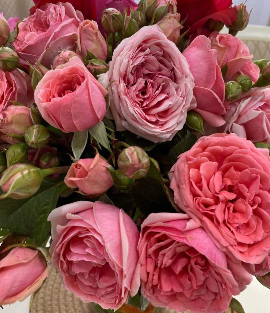По мере цветения бутонов роз срезайте отцветшие соцветия. После того как все бутоны отцвели, можно простимулировать вторую волну цветения. Для этого кустовые розы обрезают коротко — на 2–3 почки после последнего среза. Обычно такую обрезку делают однократно после первой волны цветения в начале июня. Далее достаточно срезать только отцветшие соцветия. Шрабы и плетистые розы летом обрезают только соцветия и лишние торчащие ветви. Кардинальную обрезку проводят только раз в год — весной. Обработка от вредителей и болезней включает использование различных средств. Летом от вредителей применяют препараты: Фитоверм Форте, раствор ромашки, Алатар и Фуфанон. Для профилактики болезней, таких как пятнистости и мучнистая роса, ранней весной используют Абига-пик, а в апреле — Хорус. Летом чередуют препараты: Фитоспорин, Алирин и Гамаир. В случае необходимости лечения применяют средства: Топаз, Скор или Ридомил Голд для борьбы с пятнистостями и мучнистой росой, чередуя их по мере необходимости. Посл