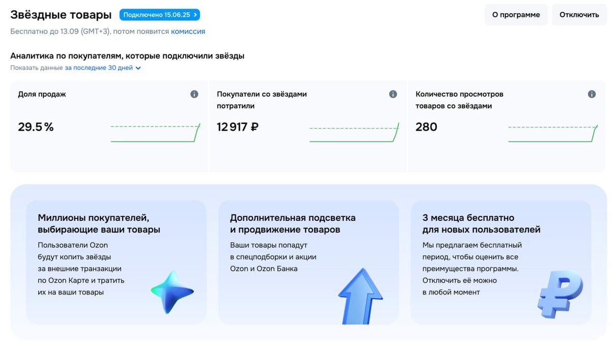 🌟 "Звёздные товары" на Ozon — работает ли это вообще? Тестировал эту механику полгода назад. Сейчас снова решил попробовать — вдруг что-то поменялось. 🧩 Где искать: Продвижение → Механики лояльности → Звёздные товары Суть в двух словах: Пользователи копят баллы за траты по карте Ozon вне самого маркетплейса. Потом эти баллы они могут потратить у нас в магазинах — покупая товары за символический 1₽, а Ozon компенсирует нам всю стоимость. Звучит заманчиво. Но есть нюанс. 🤔 Что меня смущает: Если человек реально хотел купить мой товар — он бы и так его купил. А если купил только потому, что «баллы сгорят» — то это не новый клиент, а просто повод для списания. Мы сейчас снова включили программу (там, кстати, дают 3 месяца бесплатно), и какого-то ощутимого буста не увидел. При этом в аналитике пишут, что 29% продаж якобы пришли по этой механике. Но важно: отчёт странно считает объём — явно занижает итоговые цифры. Короче, по ощущениям: 📌 Влияет ли на продажи? — Скорее незначитель