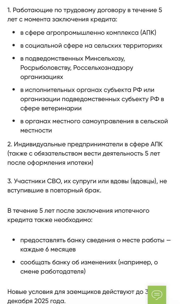 Здравствуйте! У меня есть статья о сельской ипотеке, которую я пол числа в 2020 году. В настоящий момент условия чуть поменялись, но в то же время ее возможно взять. Обратите внимание, что с момента взятия такой ипотеки вы должны 5 лет отработать в указанных сферах. Но НЕ ДО взятия ипотеки. кроме того, сельскую ипотеку можно взять только 1 раз. Банк , предоставляющие такую ипотеку: хочу отметить, что я свою взяла в россельхоз банке, другие мне отвечали, что лимит у них уже исчерпан. Я советую обращаться везде, общаться с менеджерами и узнавать именно об этой программе льготной ипотеки, потому что многие прибалтывают на обычный ипотечный продукт.