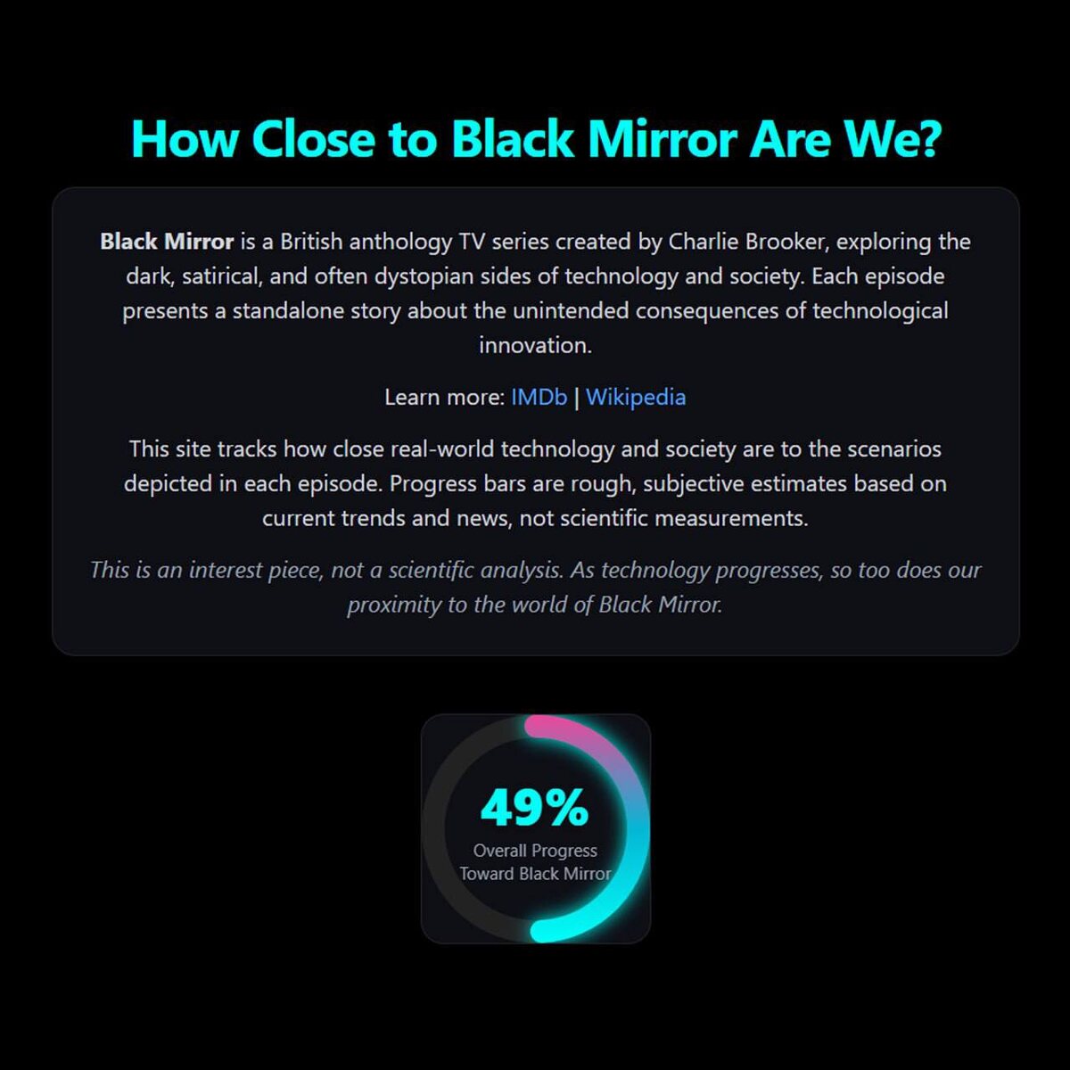 В интернете обнаружили сайт, который показывает, насколько наш мир приблизился к «Черному Зеркалу». Этот сериал-антиутопия рассказывает о страхах, связанных с технологиями, и некоторые его эпизоды совпадают с реальностью на целых 80%. На данный момент итоговое значение составляет «всего» 49%. NeuroFlux #ИИ #Технологии #наука #нейросети #ИнтернетСвобода #ИскусственныйИнтеллект