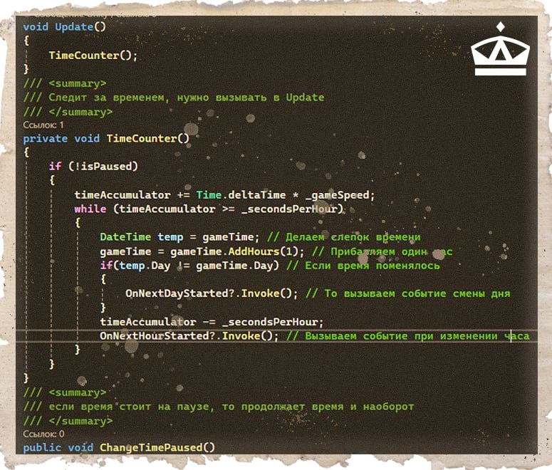 ⚡️Друзья! Делимся с вами кусочком обновленного кода. Работа идет, сейчас мы занимаемся изменениями и улучшениями в старых системах и существующих механиках. Требуется переписать очень много строк кода.😢 💥Мы работаем над качеством! Это нужно для оптимизации, читаемости и надежной работы скриптов. На изображении представлен кусок скрипта TimeManager-а, который отвечает за внутреигровое время. Спасибо что вы с нами!❤️ Следите за новостями в нашем телеграмме! #Мысли_Министерства