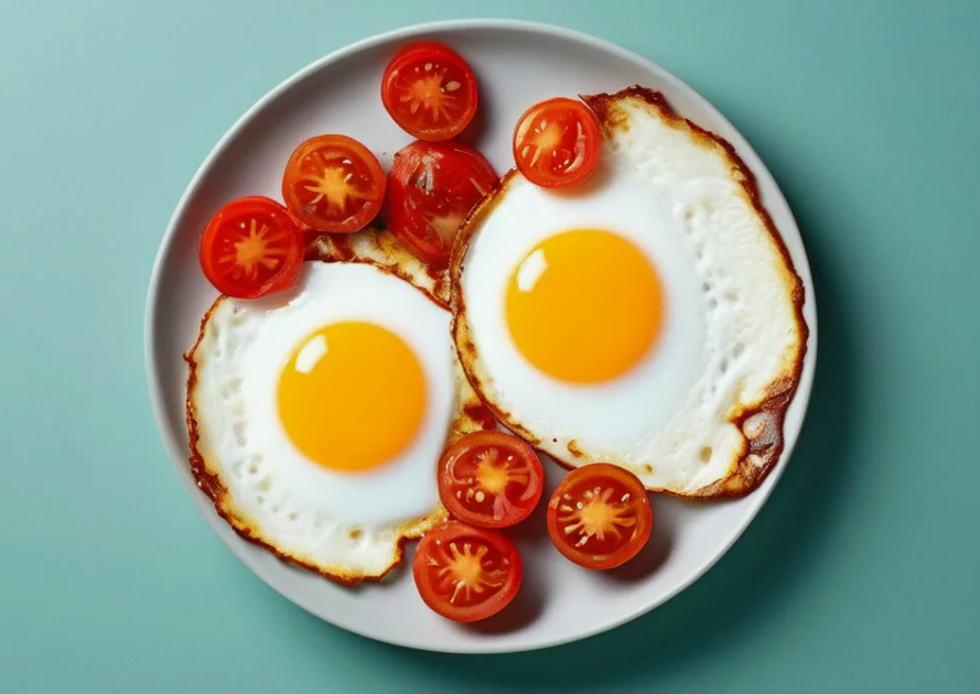 ✅ Пожарила яичницу из двух яиц. Добавила 4 помидора черри.