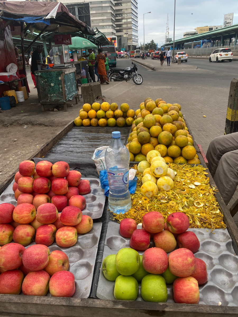 У нас сезон апельсинов, они на каждом углу горами лежат. Один апельсин стоит 6 ₽, яблоко — 30 ₽.