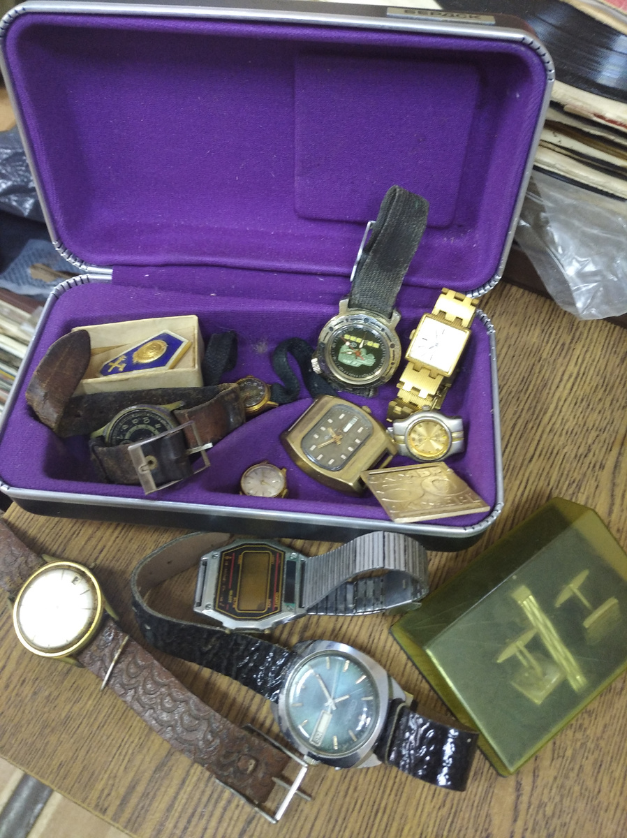 Привет, друзья, прошу прощения что пропала, но пропала я именно в дзен временно. Меня много в чате ТГ в распродаже и болталке . Кстати кто ещё не подключился очень рекомендую А это распродажа Тут жизнь кипит ))) А пока расскажу вам что вообще происходит : По закупкам пока больше не выезжали , у мужа стройка на даче , строит навес , что бы туда ставить лодку , строит все сам , потому что все умеет и потому что строит капитально . Соответственно времени на закупы нет. Приносы в скупку есть , но не сильно много , покажу вам часть Вот такой вот коробок с часами принес дедулька . В чат девочкам уже показывала , сюда вот сейчас показываю . Ничего не разбирала , просто пока лежим на складе . Сейчас задача освободить склад от посуды , от фарфора и стекла . И благодаря распродаже много посуды , просто очень много ушло . Чат хорош скоростью и количеством продаж в одни руки. Но ещё не в ноль, ещё есть над чем поработать . Затем было много книг ,книги стараюсь принимать по 10-5 руб . И се
