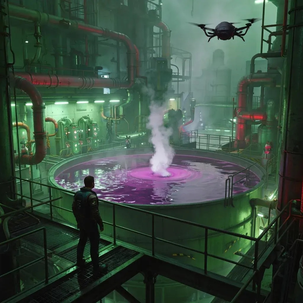 – Держись близко! – Алекс рванул к узкой служебной лестнице, «Тень» – его неотступной тенью, отсекая толпу слабыми разрядами. Они настигли Арриса на шаткой металлической галерее, нависающей над гигантским чаном с бурлящей фиолетовой жидкостью – нейротоксином «Тихий Шёпот», используемым для «стабилизации» синтез-мяса. Пар щипал глаза, запах миндаля и озона висел в воздухе.