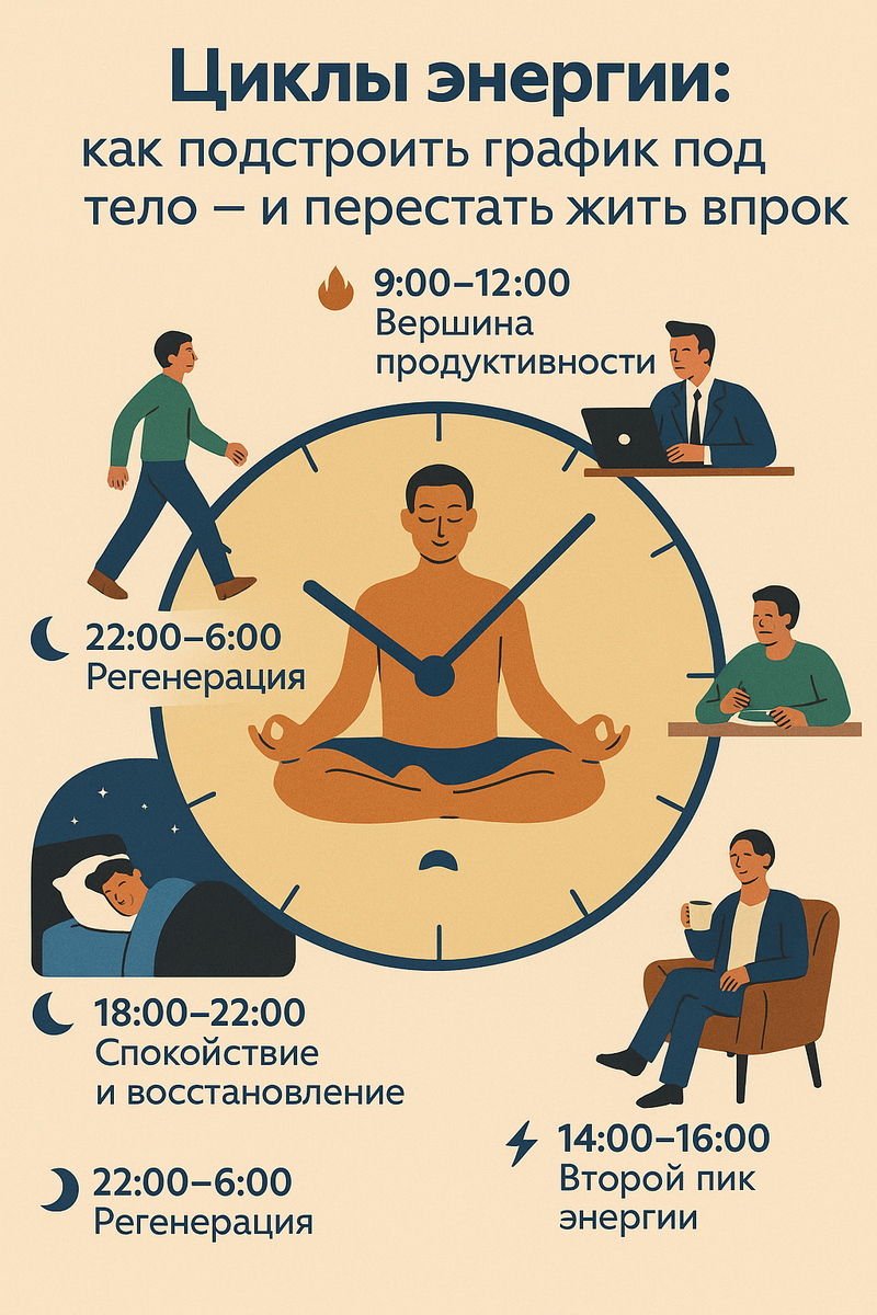 У каждого из нас есть естественные циклы энергии — пики бодрости, спады, время для концентрации, для креатива и для отдыха. Если вы научитесь их распознавать и синхронизировать с графиком дел, результаты растут, а усталость уменьшается.