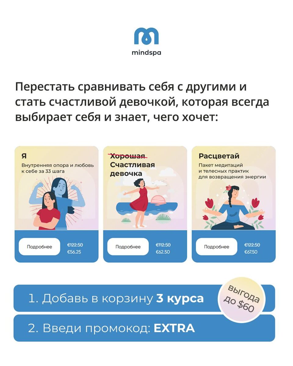😍 Вау! Такого не было с «Чёрной пятницы»! Сегодня у тебя есть крутая возможность забрать сразу 3 курса самотерапии по цене 2 ⭐️ Промокод: EXTRA ⭐️ Хотим тебя предупредить: с 1 июля цены повысятся, и так выгодно уже не будет. Забирай курсы сейчас — и пусть они всегда будут у тебя под рукой. АКТИВИРОВАТЬ ПРОМОКОД Как получить 3 курса по цене 2: ➡️ Перейди по ссылке ➡️ Добавь в корзину ТРИ ЛЮБЫХ ПРОДУКТА (можно выбрать из подборок наших психологов или просто взять то, что тебе нравится) ➡️ Нажми «Оформить заказ» ➡️ Введи промокод EXTRA в поле «Детали оплаты» Не переживай, что не получится пройти все и сразу — доступ останется навсегда в удобном приложении. Ты сможешь вернуться к курсам в любое удобное время и проходить их в своем темпе. ❕Всего 15–20 минут в день на любой курс — и ты обязательно заметишь эффект. ПЕРЕЙТИ НА САЙТ И ВЫБРАТЬ КУРСЫ