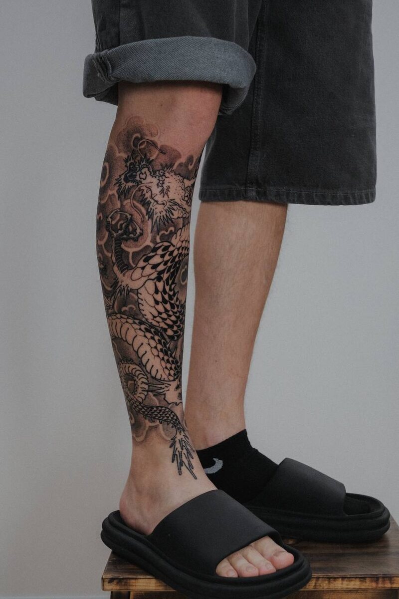 Толстенькие контура дракона с плотным закрасом чешуи для контраста. Облака для фона сделаны грейвошем, цвет при заживлении просядет и уйдет в мягкий второй план за дракона и пагоду.