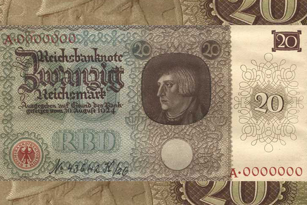 После валютной стабилизации Немецкий рейхсбанк получил право выпускать банкноты номиналом в рейхсмарках Законом о Рейхсбанке от 30 августа 1924 года в качестве Центрального резервного банка. Кроме того, ему было предложено поменять все свои банкноты, находившиеся до этого в обращении, и обменять их в соотношении 1 триллион марок = 1 рейхсмарка. Первые банкноты в рейхсмарочных номиналах поступили в обращение в начале ноября 1924 года. Банкноты Рейхсбанка печатались только в берлинской типографии Рейха. В период "Веймарской республики" и т. н. "Третьего рейха" банк создал целую серию черновиков, очерков и пробных оттисков банкнот Рейхсбанка, которые так никогда и не попали в обращение. С даты 2.1.1926 года была запланирована целая серия банкнот Рейхсбанка номиналом 10, 20, 50 и 100 рейхсмарок, которая, как предполагалось, должна была заменить предыдущую серию. Некоторые из созданных для этой цели пробных оттисков содержат рукописную записку Директората Рейхсбанка. Сегодня такие произведе
