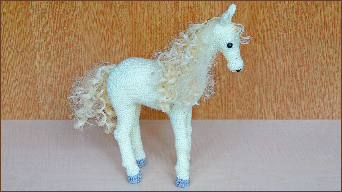 Лошадь связана крючком 2,5 мм. Пряжа 100% акрил; в 50 граммах 200 метров. Высота лошади без учета ушей 25 см, а длина без учета хвоста 19 см. Хвост и грива сделаны из трессов для кукол. Ссылка указана ниже: https://rutube.ru/video/0ca85921263275fb3348a5241cd1f62b/