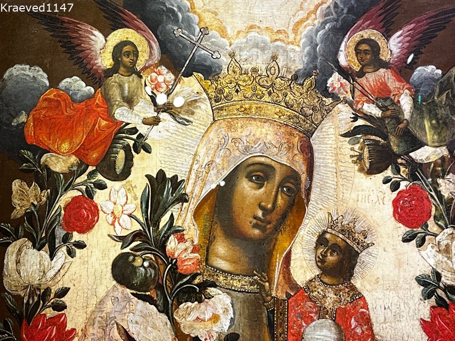 В собрании Государственной Третьяковской галереи хранится дивная икона XVIII века "Неувядаемый цвет". Представляю фрагмент иконы. Вся композиция выглядит следующим образом: Выполнен образ во второй четверти XVIII столетия, то есть между 1726 и 1750-м годом, то есть её могли написать и во время правления Екатерины I, и во время краткого царствования Петра II, и в годы царствования Анны Иоанновны, правившей с 1732 по 1742 год. Вполне возможно, что образ написали, когда на российском престоле воцарилась дщерь Петрова - Елизавета Петровна. "Родилась" икона в Москве, в эпоху галантного века в первопрестольной существовало несколько иконописных мастерских. В какой именно выполнили эту икону - не известно. Для какого храма или для чьей молельной написана Богоматерь Неувядаемый цвет тоже не выяснили. В православном искусстве образ под названием «Неувядаемый Цвет» — весьма почитаем. Не ошибусь, если признаю её самой живописной иконой из всех существующих икон Богородицы. Появился образ в Кон