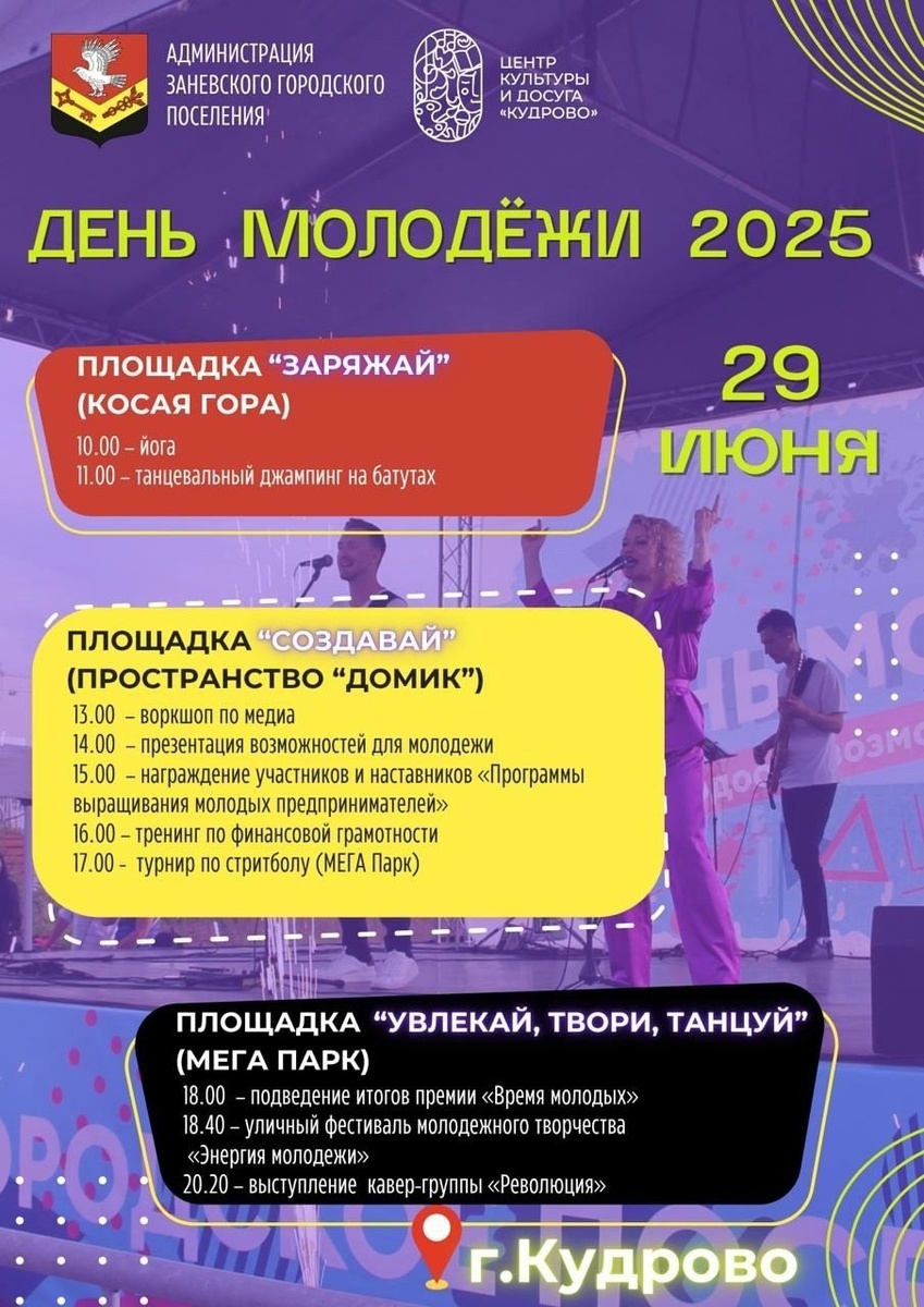 🎉 День молодёжи в Заневском поселении: танцы, мастер-классы и революция эмоций 29 июня в Кудрово состоится арт-фестиваль «Время молодых». Мероприятие развернётся сразу на трёх площадках: в сквере «Косая гора», в молодёжном пространстве «Домик» и в «Мега Парке». Организаторами выступают администрация Заневского городского поселения совместно с центром культуры и досуга «Кудрово». Заневский вестник ДТП и ЧП Кудрово