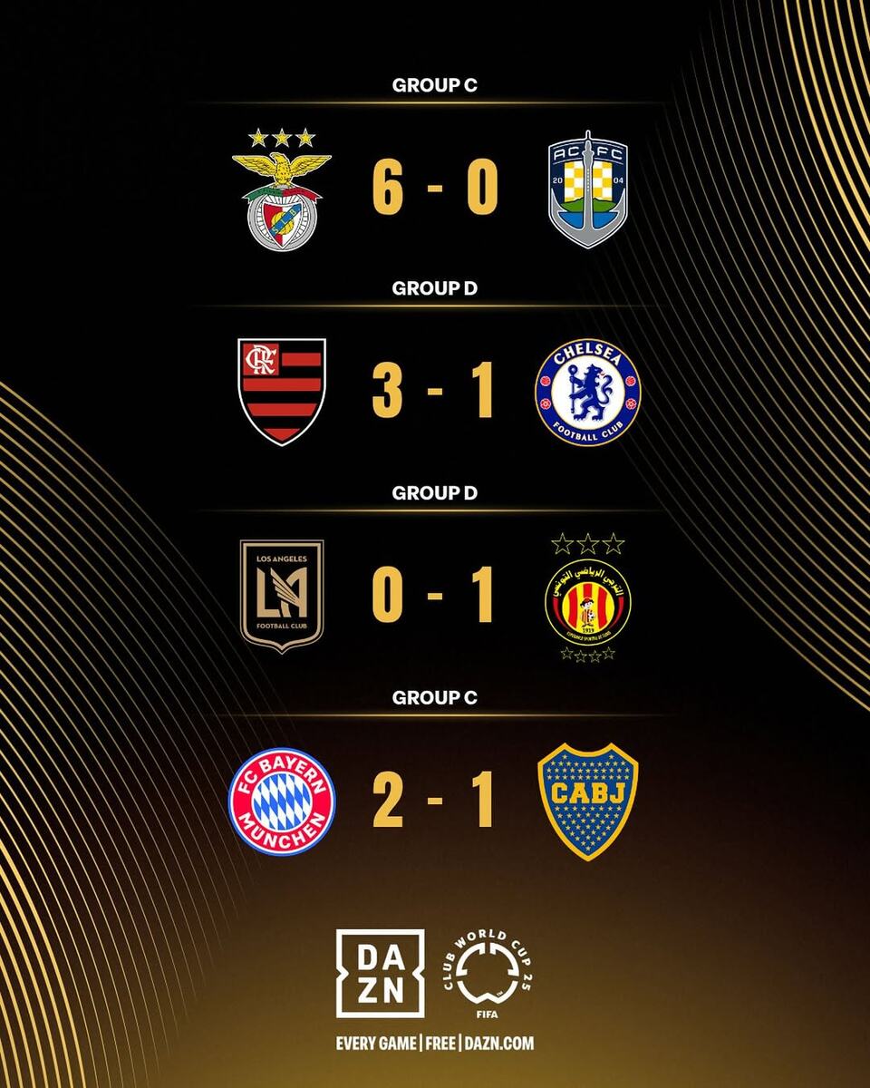 «Окленд Сити» героически отстоял весь первый тайм, пропустив лишь с пенальти, затем матч покрывали на 2 часа из-за сильного ливня, а во втором тайме «Бенфика» разгромила своего соперника. Полузащитник «Бенфики» Анхель Ди Мария – лучший игрок матча, 2 гола. Бывший игрок «Челси» Фелипе Луис добывает волевую победу на посту главного тренера «Фламенго». Бразильский клуб перевернул игру за 6 минут, забив дважды, также в этот игровой отрезок вышедший на замену Николас Джаксон получил удаление и оставил лондонцев в меньшинстве. Нападающий «Фламенго» Бруно Энрике – лучший игрок матча, 1 гол и 1 голевая передача. «Эсперанс» минимально переигрывает «Лос-Анджелес ФК», не помог и Оливье Жиру, вышедший в основе. Американский клуб имел реальный шанс поделить очки, но не забил пенальти в самом конце матча. Коллектив из Туниса врывается в борьбу за плей-офф. Нападающий «Эсперанс» Юсеф Белайли – лучший игрок матча, 1 гол. «Бавария» дожимает «Боку Хуниорс» в конце встречи. Теперь аргентинцам нужно побе