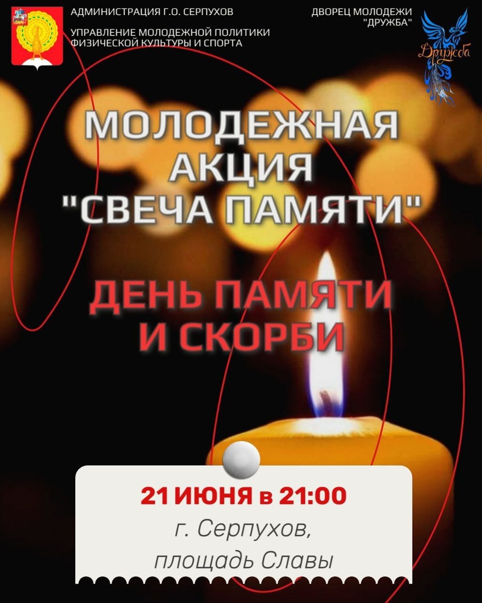 ✨ В преддверии Дня начала Великой Отечественной войны приглашаем вас принять участие в акции "Свеча памяти" 📌Акция пройдет СЕГОДНЯ на площади Славы. 🕯️Приглашаем всех желающих присоединиться к акции и отдать дань уважения подвигу нашего народа. 📆 21.06.2025 🕒 21:00 #webСерпухов ⭐Разместить публикацию ⭐Поддержать канал голосом ✅ Мероприятия Серпухов https://dzen.ru/id/66f01c6eb4c6fe60c9ca1608 http://vk.com/serpukhov_events http://dzen.ru/serpukhov_events