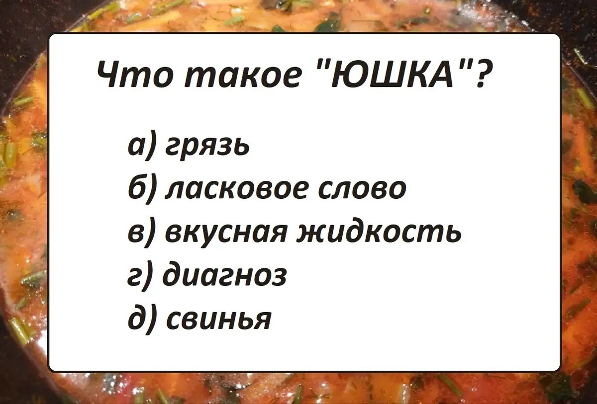 Правильный ответ: вкусная жидкость. «Юшкой» изначально называли наваристый рыбный бульон, жидкость из-под ухи с остатками рыбы, картошки и других ингредиентов. Позже так стали называть любую жидкую вкусную субстанцию в блюде.