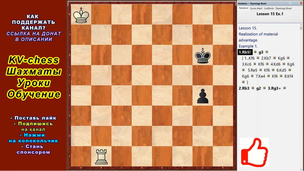 В уроке 15 мы с вами поговорим о реализации большого материального перевеса в шахматах. Как это правильно делать во время партии. Существует три способа: Первый — это разумное упрощение. То есть, если у вас лишняя фигура, то вы равноценно размениваете оставшиеся фигуры, и в эндшпиле с лишней фигурой выигрываете партию. Второй способ — атака на короля большинством фигур. У соперника просто не хватит материала, чтобы защититься. И третий способ — атака лишней фигурой слабых фигур и пешек соперника с целью их выигрыша. Плейлист со всеми уроками для начинающих: https://dzen.ru/suite/1c93efae-1579-45ca-8c68-4b9c4da291d2 Видео по этому Уроку - внизу. В примере внизу у белых лишняя ладья. Задача белых — не дать черным провести пешку g4 в ферзи. При поддержке черного короля, пешка хорошо идет к полю превращения, так как она защищена. Следовательно, за белых возникает идея отрезать короля черных от пешки и лишить ее помощи и защиты. Во втором примере у белых лишний слон. Король чёрных вынужд