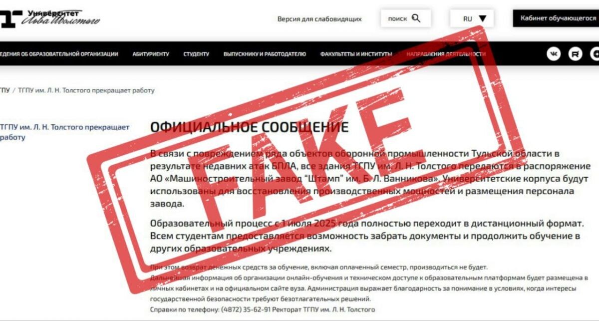 «Университет Льва Толстого не имеет отношения к распространяемой информации. Вуз работает в штатном режиме и с сегодняшнего дня начал прием документов от абитуриентов на программы бакалавриата, специалитета и среднего профессионального образования», – написал вуз в соцсетях.
