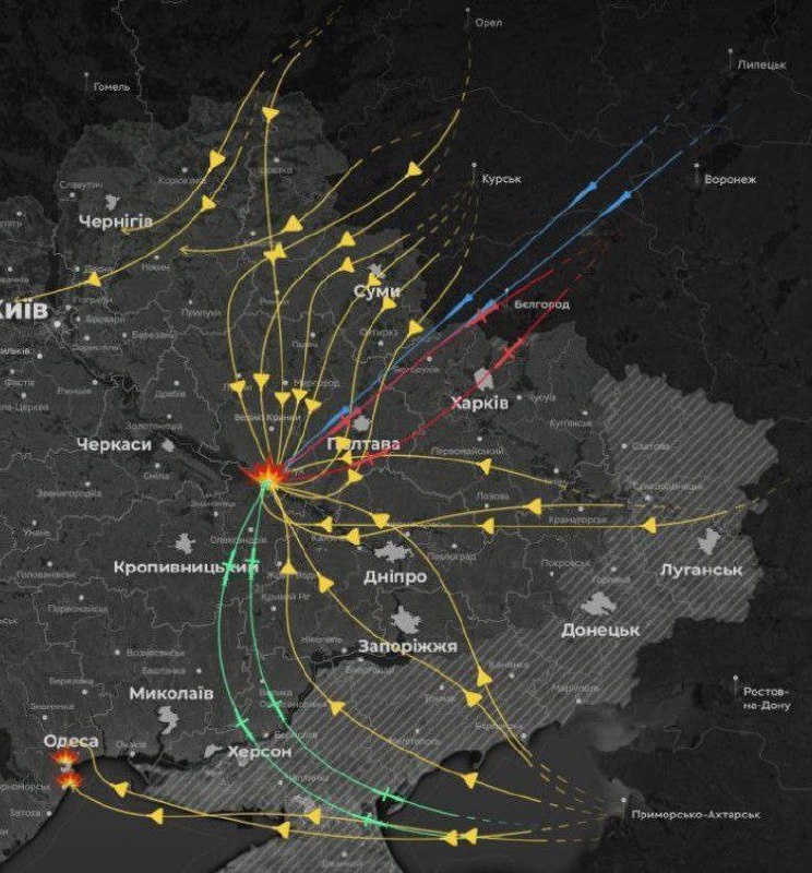 ❗️🗺Объекты энергетической инфраструктуры в Кременчуге после массированного удара "Геранями-2". На тактической карте отмечены маршруты выхода БПЛА-"камикадзе" к целевому району. После прилетов в промышленной зоне города начался сильный пожар. Украинские ресурсы сообщили, что горит местный нефтеперерабатывающий завод. Местные власти заявляют о поражении инфраструктурного объекта. Также украинские СМИ пишут, что всего было около 50 прилетов. Очевидцы публикуют в соцсетях многочисленные фото и видео пожара. На кадрах видно яркое зарево. Весь город затянуло дымом. Также слышны сильные взрывы и попытки украинской ПВО отразить атаку. Неделей ранее удар был комбинированный (с применением СКР "Калибр-НК", Х-101 и аэробаллистических ракет Х-47М2 "Кинжал"). https://dzen.ru/id/6425916a1950720421f18802