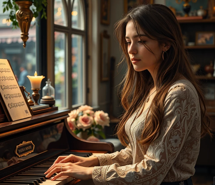 Он увидел её. Она сидела за пианино, её длинные каштановые волосы падали на плечи, а пальцы легко и изящно скользили по клавишам. Она была полностью поглощена музыкой, казалось, что она и пианино – единое целое. Алекс замер, боясь нарушить волшебство момента. Он просто стоял и слушал, очарованный не только мелодией, но и её красотой.