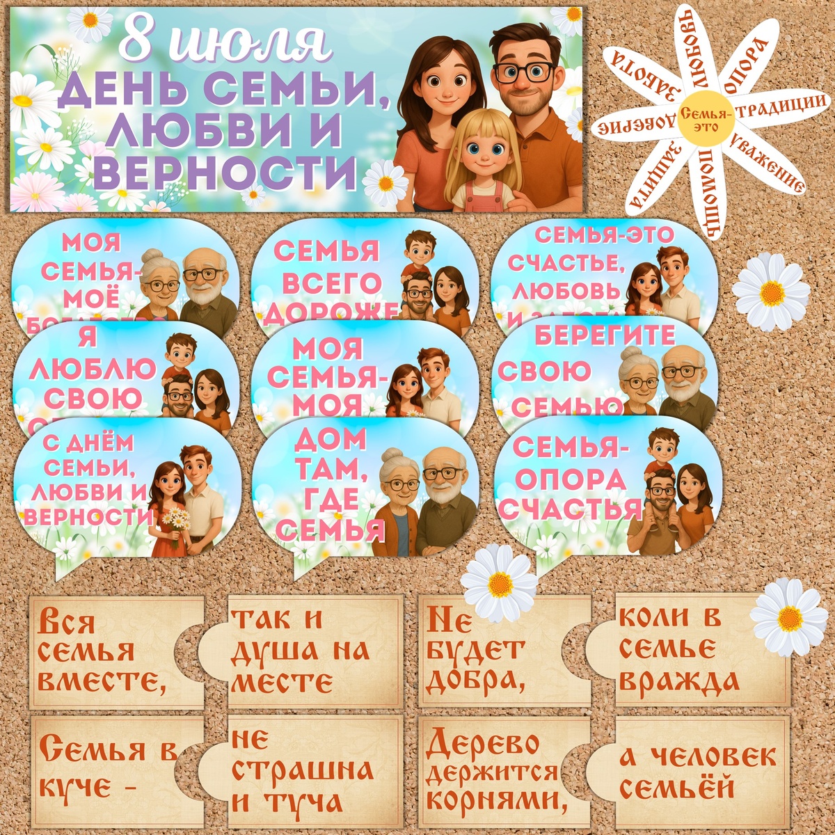 Оформление «День семьи, любви и верности» (8 июля) Материал предназначен для проведения тематических мероприятий ко Дню семьи, любви и верности. Все элементы разработаны таким образом, чтобы их легко можно было комбинировать, размещать на школьной доске, стенах или использовать в различных интерактивных форматах. В набор для оформления входят: Файл в PDF-формате на листах А4. В процессе печати можно настроить необходимый размер материалов согласно вашим предпочтениям и потребностям пространства кабинета.