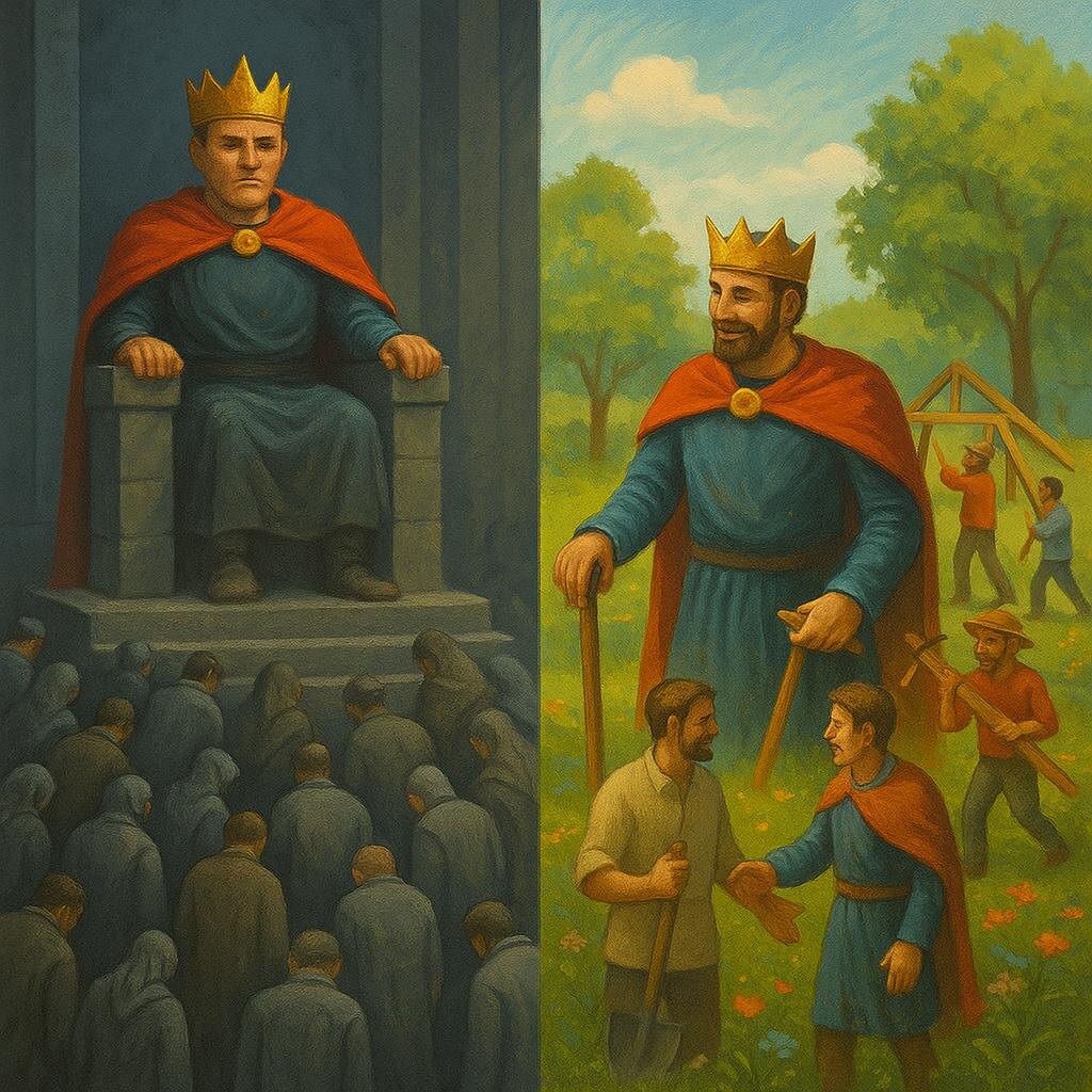 Второй ходил среди людей, помогал решать проблемы, убирал препятствия. Подданные работали с энтузиазмом. Когда он уезжал — работа ускорялась.